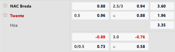 Như nhận định ở trên, Twente hòa 3/5 vòng gần nhất, đó cũng là thành tích của NAC Breda. Thành tích đối đầu của 2 đội cân bằng nhau nên nhiều khả năng trận đấu sắp tới sẽ kết thúc với tỉ số hòa. Chính vì vậy với tỉ lệ kèo Twente chấp 0.5 thì NAC Breda có cơ hội thắng cuộc cao hơn.