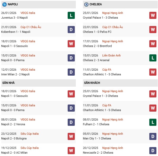- 2 trận đối đầu gần nhất giữa 2 đội, Napoli thắng 1, thua 1 trước Chelsea.