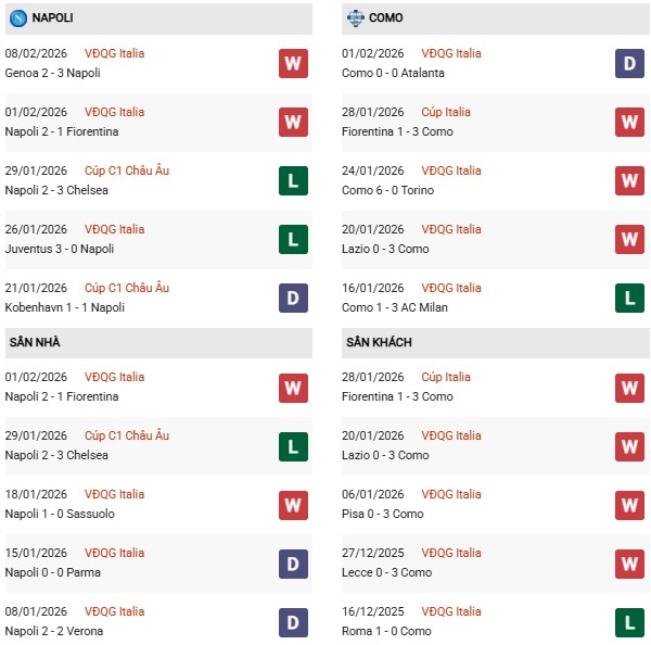 - 4 trận đối đầu gần nhất giữa 2 đội, Napoli thắng 1, thua 2 trước Como.