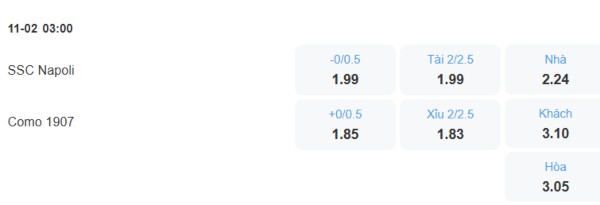 Các trận đấu của Napoli gần đây đều có ít nhất 3 bàn thắng, trận nào cũng ghi bàn nhưng không trận nào giữ sạch lưới. Đây là điều sẽ giúp họ ghi nhiều bàn vào lưới Como nhưng sẽ để đối thủ đang có phong độ cao ghi bàn. Trận đấu giữa 2 đội vì thế có nhiều bàn thắng nên với kèo tổng số bàn thắng là 2.25 thì nên chọn kèo Tài.