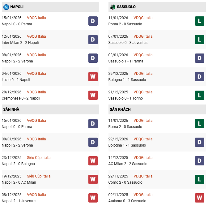 Phong độ sân khách cũng là điểm trừ lớn với Sassuolo. Đội bóng này đã không thắng trong 4 chuyến làm khách gần nhất tại Serie A, đồng thời không thể ca khúc khải hoàn trên sân của Napoli ở 3 lần đối đầu gần đây.