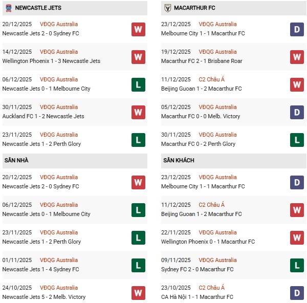 Thống kê phong độ Newcastle Jets vs Macarthur: