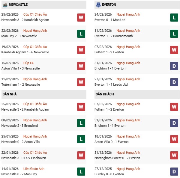 Trong khi đó, Everton cũng đang gặp khó khăn trong việc duy trì phong độ ổn định, đặc biệt là trên sân khách. Everton có xu hướng thi đấu chắc chắn nhưng thiếu đột biến trong tấn công, với hiệu suất ghi bàn khá thấp trung bình khoảng 1 bàn mỗi trận từ đầu mùa và thường gặp khó khi đối đầu những đội bóng có chiều sâu đội hình như Newcastle.