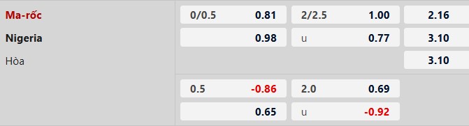 - Tối thiểu 1 bàn hiệp 1: 5/7 trận gần đây của Morocco và 5/6 trận đấu vừa qua của Nigeria đều có từ 1 bàn thắng trở lên trong hiệp 1. Tình trạng tương tự xảy ra ở 2 cuộc chạm trán gần nhất giữa 2 đội.