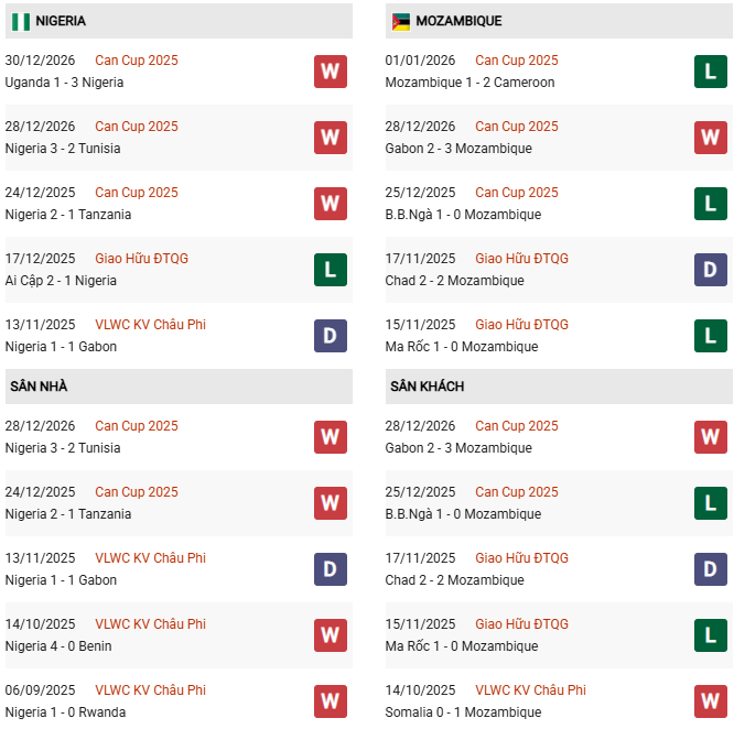 Thống kê phong độ Nigeria vs Mozambique: