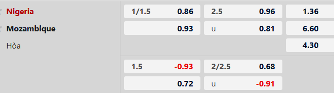 TLCA đang niêm yết mức kèo Nigeria chấp từ -1 1/4 theo handicap. Đây là mức chấp cao nhưng hoàn toàn hợp lý. Nigeria đã thắng kèo châu Á ở 2/3 trận vòng bảng. Với hàng công đang đạt hiệu suất hơn 2.6 bàn/trận, việc vượt qua rào cản handicap trước một Mozambique đang sứt mẻ lực lượng (vắng Nene và Diogo Calila do chấn thương) là nhiệm vụ trong tầm tay của thầy trò Eric Chelle