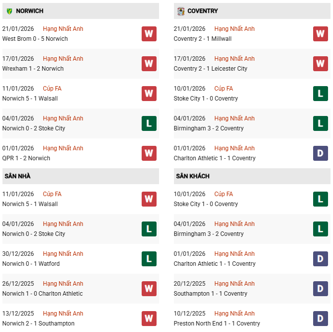 Thống kê phong độ Norwich vs Coventry: