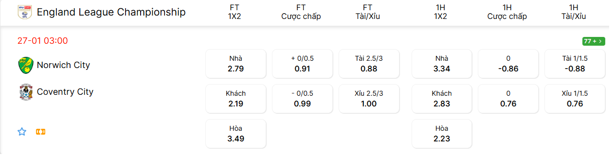 Nhận định kèo Norwich vs Coventry, 03h00 ngày 27/01, vòng 29 Hạng Nhất Anh. Norwich sẽ tiếp Coventry trên sân nhà với mục tiêu giành chiến thắng để tạo khoảng cách an toàn với nhóm xuống hạng. Đây không phải điều dễ thực hiện bởi đối thủ của họ đang đứng đầu bảng.