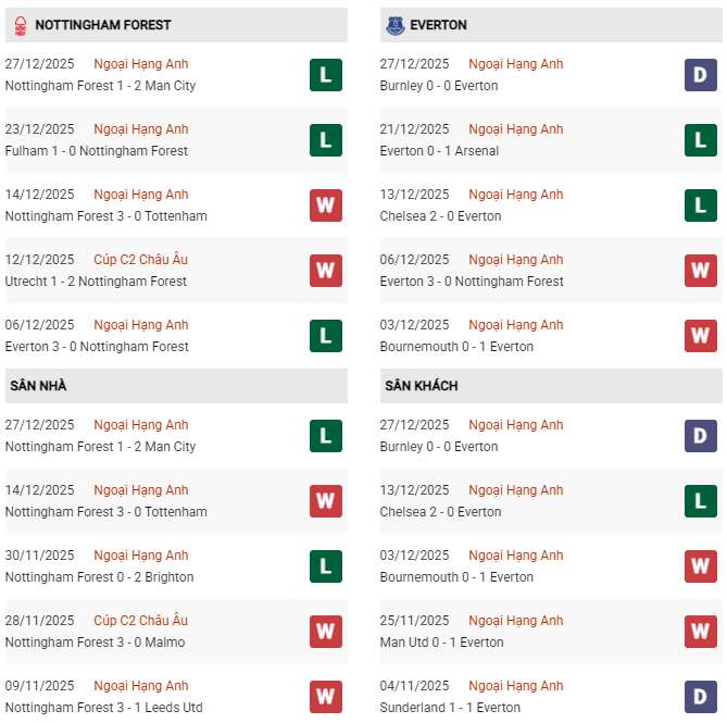Các trận đấu gần đây của Everton cũng có xu hướng ít bàn thắng, khi 5/6 trận gần nhất chứng kiến ít nhất một đội không thể ghi bàn. Điều này cho thấy hàng thủ của họ hoạt động tương đối hiệu quả, nhưng đổi lại, hàng công lại chưa mang đến sự yên tâm cần thiết. Một điểm đáng chú ý là Everton đang sở hữu thành tích sân khách rất tốt trước Nottingham Forest, khi bất bại trong 5 chuyến làm khách gần nhất tại sân The City Ground ở khuôn khổ giải VĐQG. Đây chắc chắn sẽ là nguồn động lực tinh thần lớn cho đội bóng áo xanh.