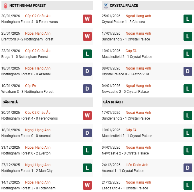 Ở chiều ngược lại, Crystal Palace có thành tích 7 thắng, 7 hòa và 9 thua, ghi 24 bàn và thủng lưới 28 lần. Lối chơi của Palace mang thiên hướng chặt chẽ, ưu tiên sự an toàn nơi hàng phòng ngự và tổ chức phản công nhanh. Dù vậy, điểm yếu của đội khách nằm ở khả năng chơi trên sân đối phương. Crystal Palace thường gặp khó trong việc triển khai thế trận khi phải đá xa nhà, đặc biệt là trước những đối thủ có xu hướng chơi áp sát mạnh như Nottingham Forest.