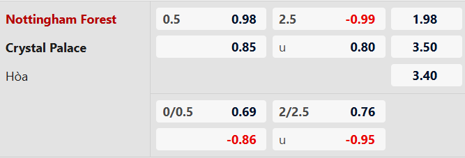 Việc TLCA ra kèo Nottingham Forest chấp -0.5 cho thấy niềm tin đáng kể dành cho đội chủ nhà. Đây là mức chấp không hề thấp nếu xét đến vị trí trên bảng xếp hạng, và nó phản ánh đúng yếu tố sân bãi cũng như động lực trụ hạng của Forest. Trong bối cảnh Crystal Palace không có phong độ quá thuyết phục khi làm khách, Nottingham Forest hoàn toàn có cơ hội giành trọn 3 điểm nếu tận dụng tốt những tình huống cố định và sai lầm nơi hàng thủ đối phương.