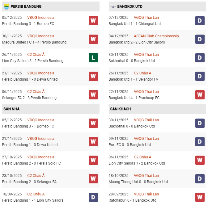 Thống kê phong độ Persib Bandung vs Bangkok United: