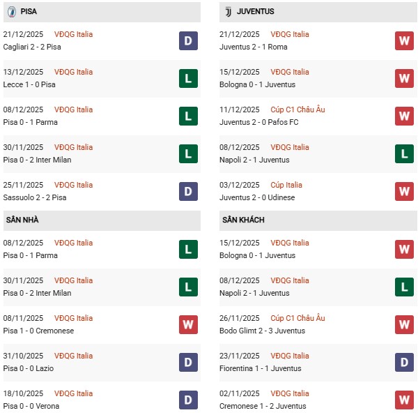 Thống kê phong độ Pisa vs Juventus: