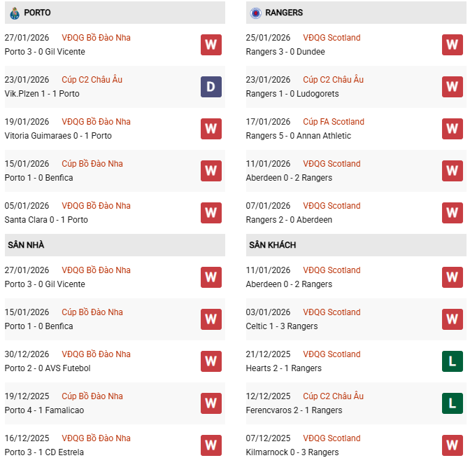 Thống kê phong độ Porto vs Rangers: