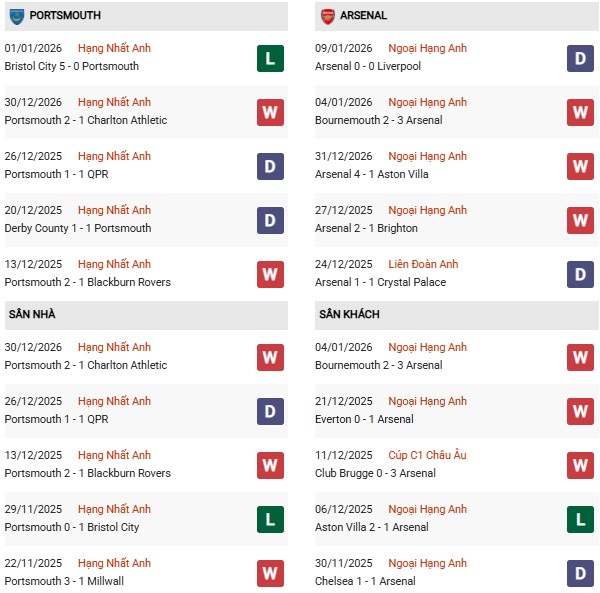 Thống kê đối đầu Portsmouth vs Arsenal: