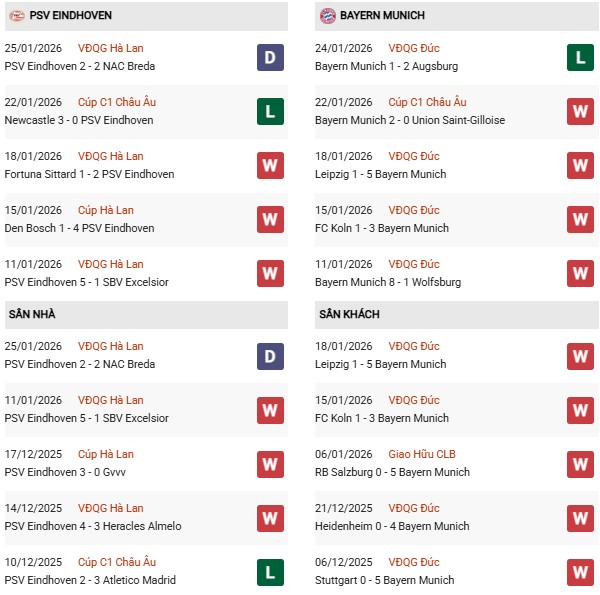 Thống kê phong độ PSV Eindhoven vs Bayern: