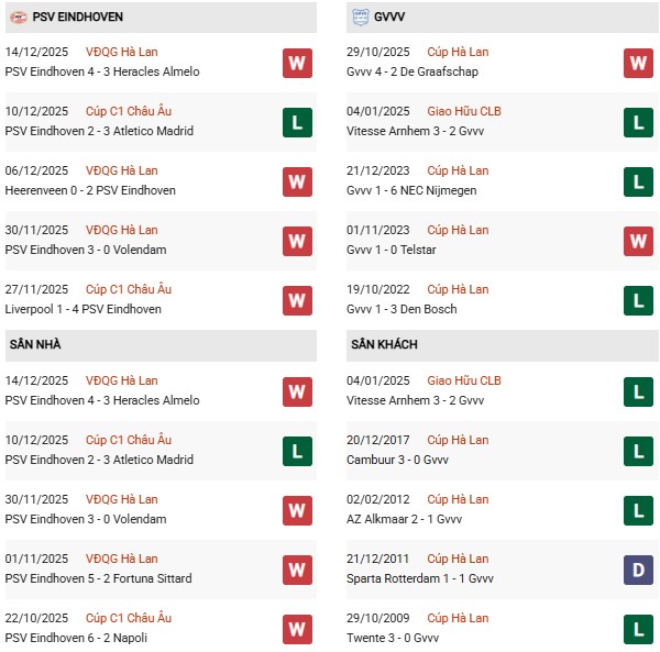 Thống kê phong độ PSV Eindhoven vs GVVV: