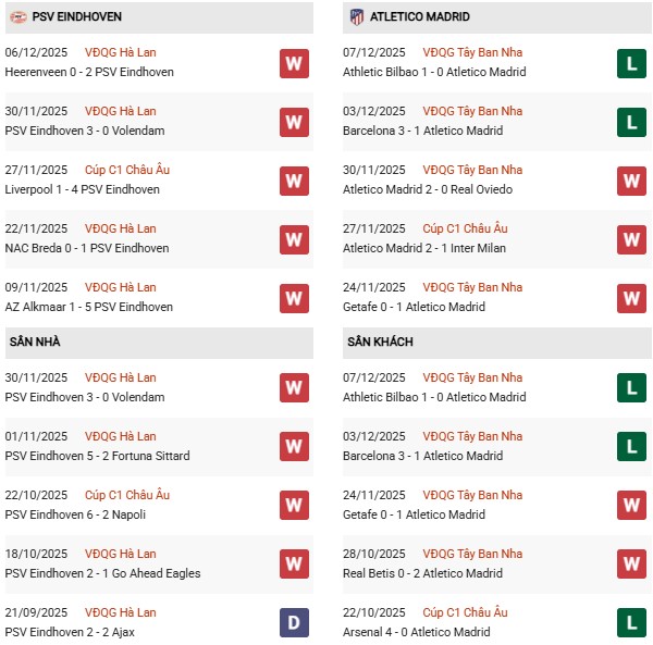 Thống kê đối đầu PSV vs Atletico Madrid: