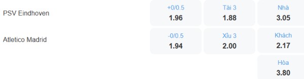 Ở 2 lần gặp nhau trước đây Atletico Madrid đều thắng PSV. Đội bóng Hà Lan dù đang có phong độ tốt nhưng khi ra Champions League thì kinh nghiệm và bản lĩnh trận mạc rất quan trọng, đây là điều khả năng các cầu thủ Atletico Madrid sẽ thể hiện trận này để có chiến thắng. Với tỉ lệ kèo Atletico Madrid chấp 1/4 trái thì nên đặt niềm tin vào các vị khách.