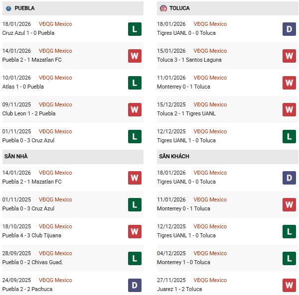 - Toluca toàn thắng cả 3 trận đối đầu vừa qua trước Puebla.