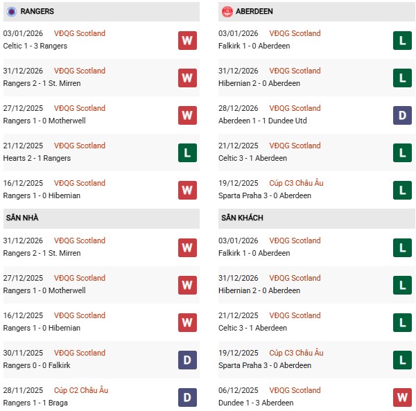 - 10 trận đối đầu gần nhất giữa 2 đội, Rangers thắng 5, thua 3 trước Aberdeen.