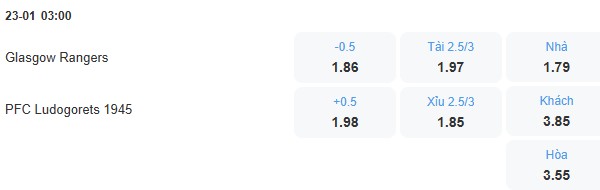 Rangers dù chơi rất tệ nhưng thực tế họ vẫn có đội hình mạnh hơn so với Ludogorets. Đội bóng Scotland đã cải thiện phong độ rất nhiều khi thắng cả 5 trận đấu gần đây nên rất có thể khi trở lại Europa League họ sẽ có chiến thắng đầu tiên. Với tỉ lệ kèo Rangers chấp 1/2 trái thì nên đặt cửa cho đội chủ nhà thì cơ hội thắng cuộc cao hơn.