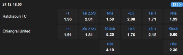 Với sự tương phản hoàn toàn về phong độ, Ratchaburi được xếp ở cửa trên với mức chấp 1 trái. Đây là tỉ lệ cho thấy niềm tin tuyệt đối vào đội chủ nhà. Trong khi Ratchaburi đang duy trì hiệu suất ghi bàn ấn tượng để bám đuổi ngôi đầu, thì hàng thủ của Chiangrai lại đang bộc lộ quá nhiều sơ hở. Với tâm lý hưng phấn khi được chơi tại sào huyệt, một chiến thắng dành cho Ratchaburi là lựa chọn rất sáng giá.
