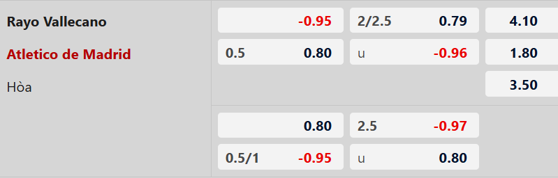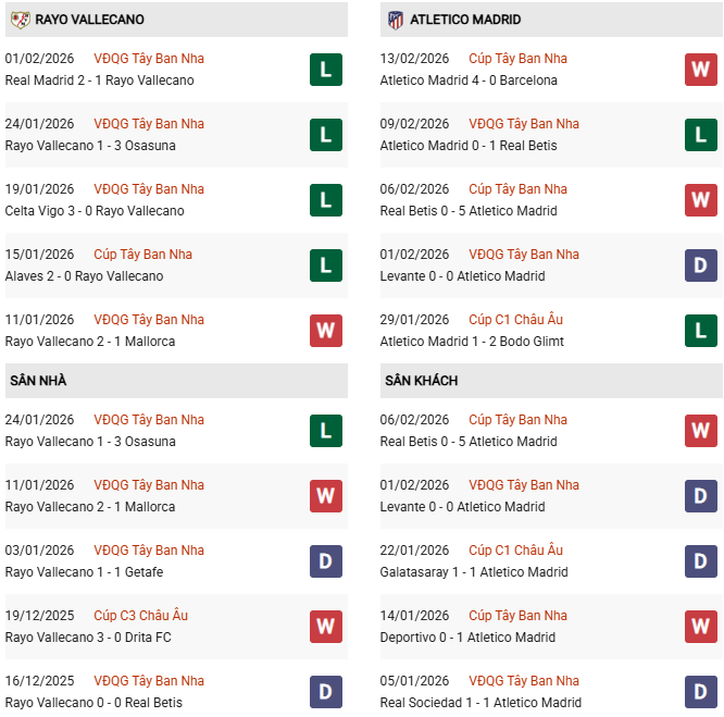 Atletico cũng có thành tích sân khách khá ấn tượng khi bất bại 8 chuyến làm khách gần nhất trước Rayo tại La Liga, đồng thời không thua trong 3 trận sân khách gần đây ở giải quốc nội.