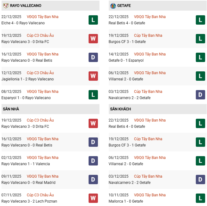 Thống kê phong độ Rayo Vallecano vs Getafe: