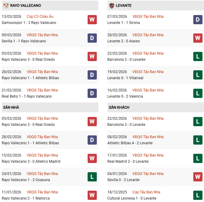 - 10 trận đối đầu gần nhất giữa 2 đội, Rayo Vallecano thắng 5, thua 4 trước Levante.