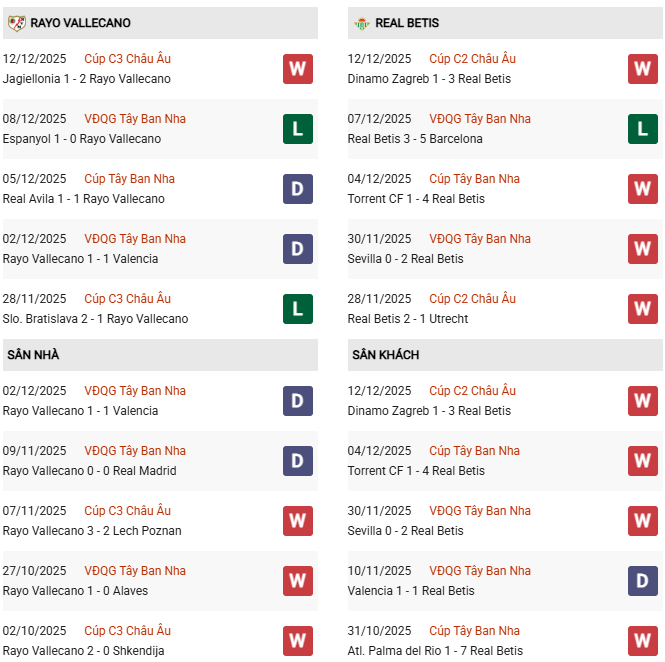 - 10 trận đối đầu vừa qua Real Betis thắng 5 thua 1 và hòa 4 trước Rayo Vallecano.
