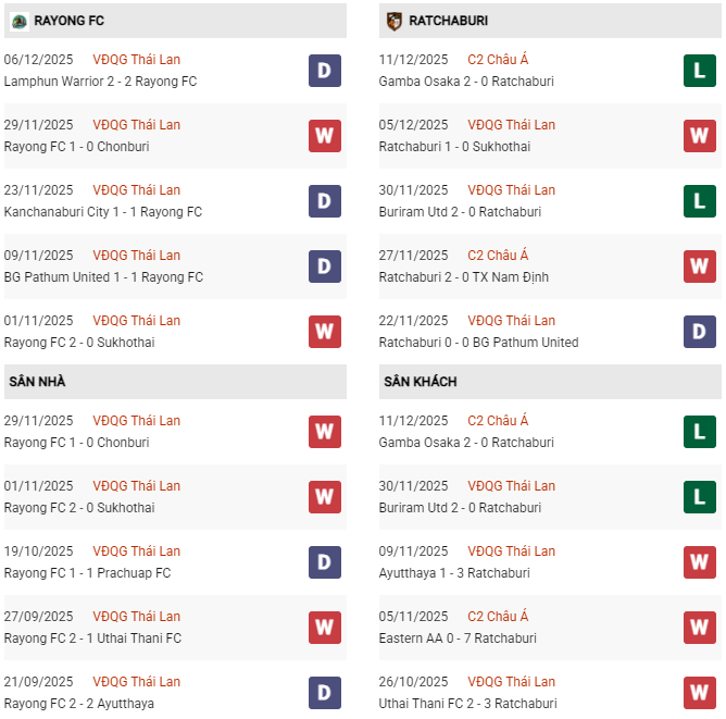 Thống kê phong độ Rayong FC vs Ratchaburi: