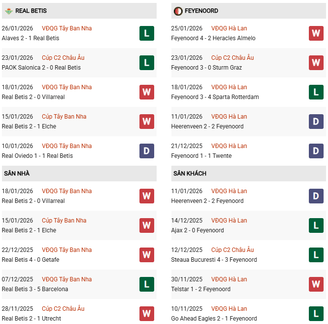 Thống kê đối đầu Real Betis vs Feyenoord: