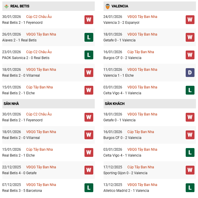 Ở lần gặp nhau gần nhất tại vòng 12 La Liga mùa này, hai đội đã hòa nhau 1-1 trên sân của Valencia. Dù không áp đảo về thế trận, Real Betis vẫn cho thấy sự khó chịu và bản lĩnh trong những trận đấu lớn. Với lợi thế sân nhà, phong độ tốt hơn cùng chất lượng đội hình nhỉnh hơn, Real Betis nhiều khả năng sẽ là đội kiểm soát thế trận.Valencia có thể gây ra một số khó khăn nhất định, nhưng sự thiếu chắc chắn nơi hàng phòng ngự khiến họ khó tránh khỏi thất bại.