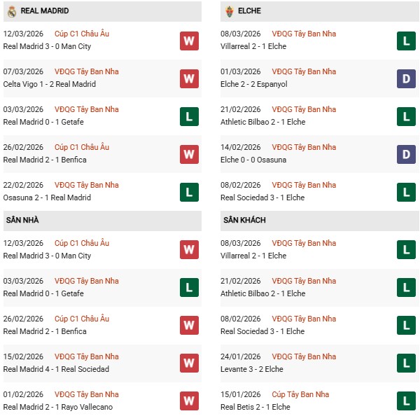- 10 lần gần nhất gặp nhau, Real Madrid thắng 6 và hòa 4 trước Elche.
