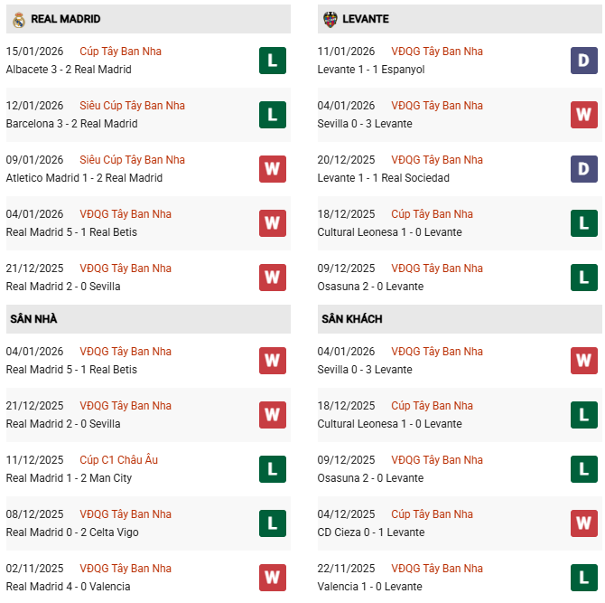 - 2 lần gần nhất gặp nhau, Real Madrid đều đánh bại Levante với những tỷ số cách biệt.