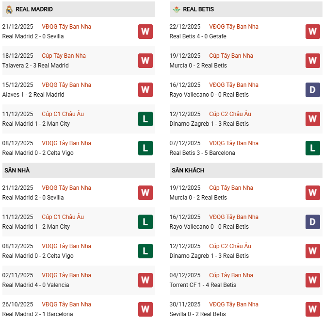 Thống kê phong độ Real Madrid vs Real Betis:
