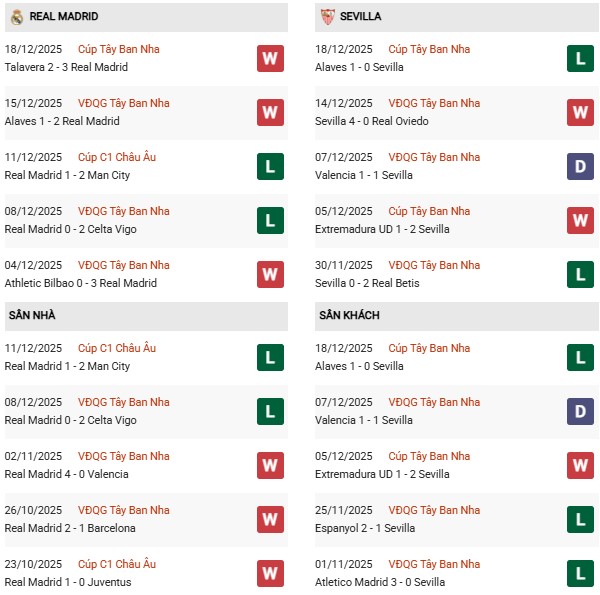 Thống kê đối đầu Real Madrid vs Sevilla: