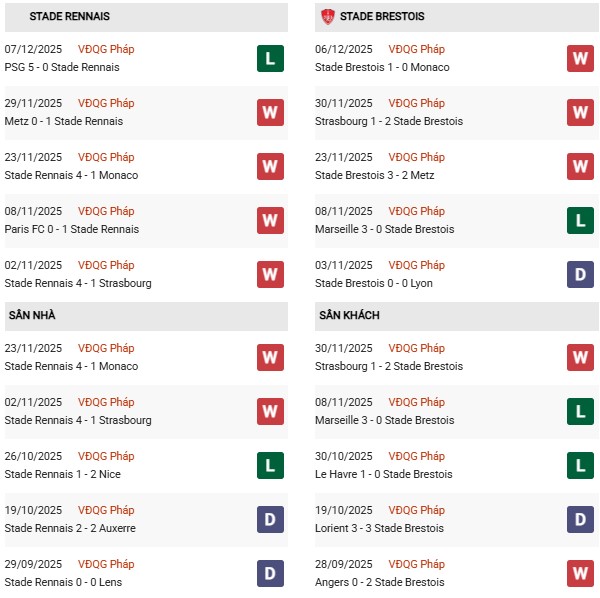 Trong 10 trận đối đầu gần nhất, Rennes thắng 5 thua 2 và hòa 3 trước Brest.