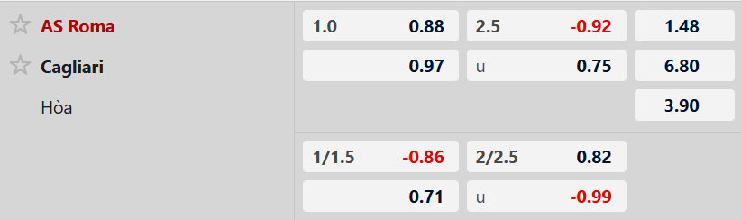 Ở chiều ngược lại, Cagliari bước vào trận đấu với tinh thần hưng phấn sau chiến thắng đậm 4-0 trước Hellas Verona. Hàng công của đội khách đang cho thấy sự cải thiện rõ rệt khi ghi 9 bàn trong 6 trận gần nhất. Tuy nhiên, cần lưu ý rằng phong độ sân khách của Cagliari lại là điểm trừ lớn khi họ không thắng Roma trong 10 chuyến làm khách gần nhất tại Olimpico.