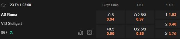Kèo châu Á hiện ra Roma chấp -0.5 (0.94), Stuttgart +0.5 (0.90). Mức chấp nửa trái cho thấy Roma được đánh giá nhỉnh hơn, chủ yếu nhờ lợi thế sân bãi và khả năng kiểm soát nhịp. Nếu Roma có bàn trước, họ đủ khả năng giữ nhịp trận đấu và vô hiệu hóa các pha phản công trực diện của đối thủ bằng cách kéo khối đội hình xuống vừa phải, siết trung lộ và đánh vào khoảng trống khi Stuttgart phải dâng lên. Ở chiều ngược lại, Stuttgart muốn có điểm sẽ phải giữ cự ly đội hình tốt, tránh để Roma có quá nhiều pha lên bóng trong trạng thái “đủ người”.