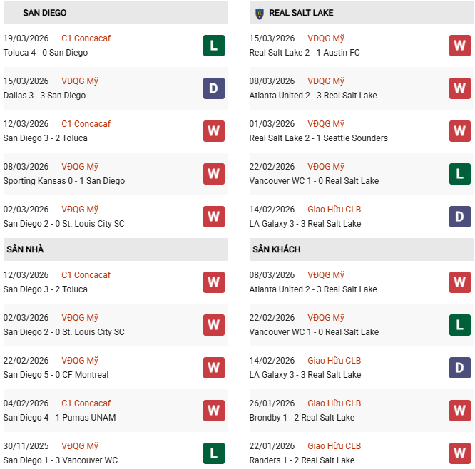 San Diego đã ghi được 11 bàn sau 4 trận đầu tiên tại MLS 2026 trong khi Real Salt Lake đã 3 trận liên tiếp nổ súng tối thiểu 2 lần. Tuy nhiên đã 7 trận liên tiếp thuộc giải Nhà nghề Mỹ, đội bóng này không thể giữ sạch lưới và hệ quả kéo theo: 5 cuộc chơi có không dưới 3 pha lập công chung cuộc. Cả hai màn so tài giữa đôi bên vào mùa trước cũng đều xuất hiện 4 tình huống lưới rung.