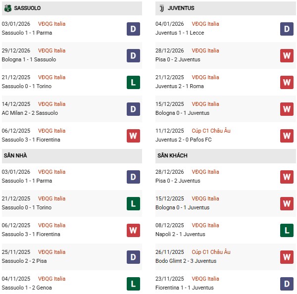 Thống kê phong độ Sassuolo vs Juventus: