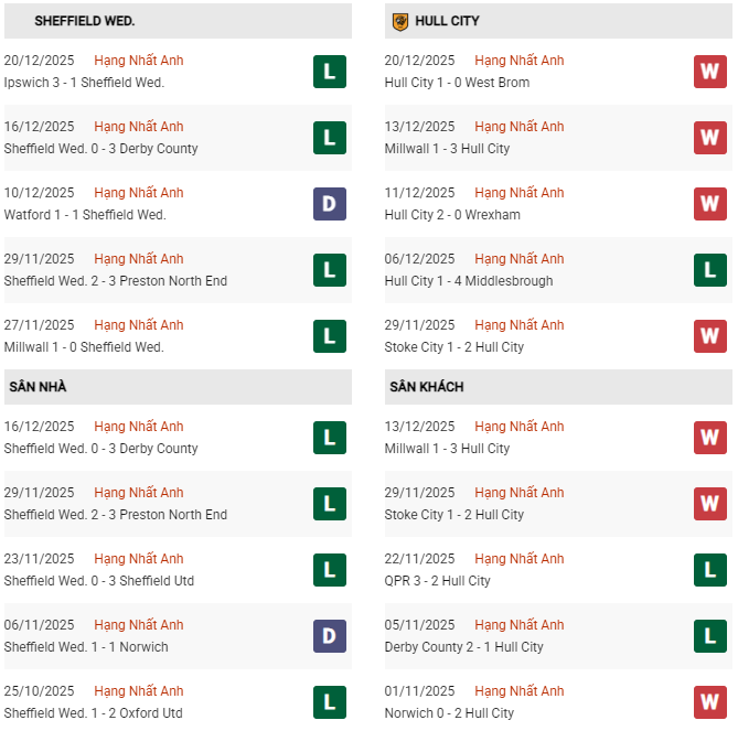 Phong độ gần đây: Hull City đã thắng 4 trong 5 trận gần nhất và vừa có chuỗi 3 trận thắng liên tiếp. Ngược lại, Sheffield Wednesday đang chìm trong khủng hoảng với chuỗi 15 trận không thắng tại Championship.