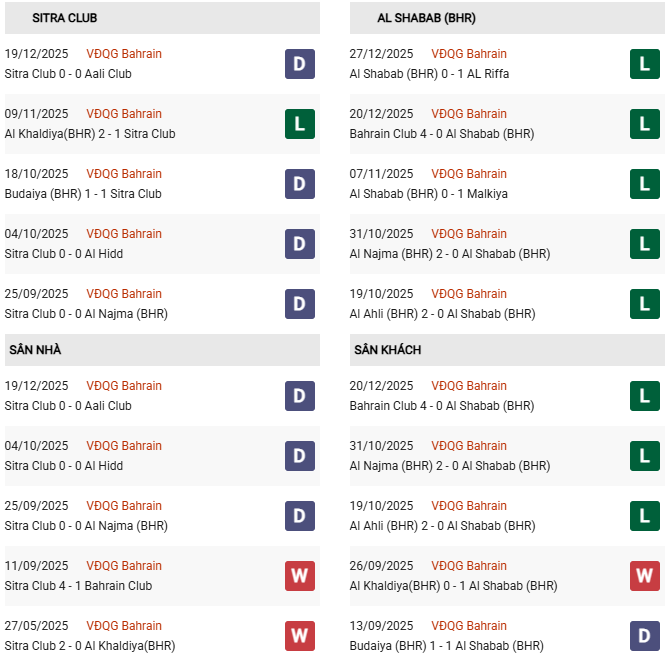 Thống kê đối đầu Sitra vs Shabab Manama: