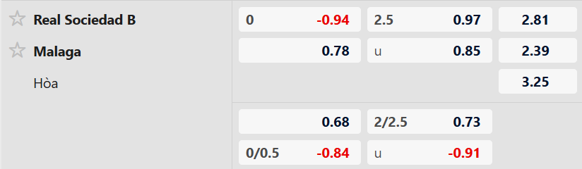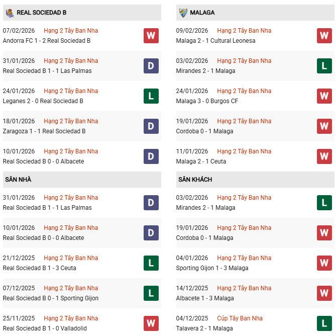 Phong độ gần đây của Sociedad B khá thất thường khi 5 trận gần nhất chỉ giành được 1 chiến thắng, còn lại là những kết quả hòa và thua xen kẽ. Điểm yếu lớn nhất của đội chủ nhà nằm ở khả năng kiểm soát thế trận và tâm lý thi đấu khi bị dẫn bàn. Trong khi đó Malaga đang duy trì sự ổn định đáng kể với chuỗi trận tích cực, đặc biệt ở khâu phòng ngự khi họ biết cách giữ cự ly đội hình tốt và hạn chế sai lầm cá nhân. Dù phải làm khách nhưng Malaga không quá e ngại bởi thành tích sân khách của họ mùa này ở mức chấp nhận được và thường chơi khá thực dụng.