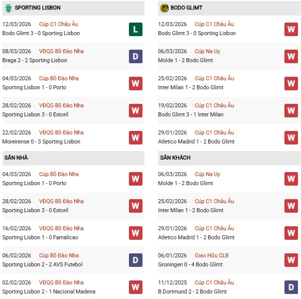 Thống kê phong độ Sporting Lisbon vs Bodo Glimt: