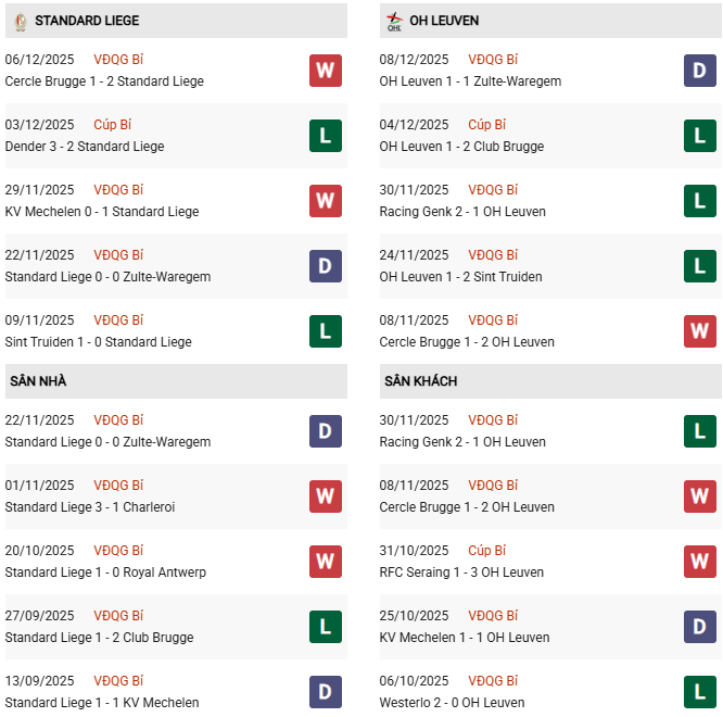 Thống kê phong độ Standard Liege vs Leuven: