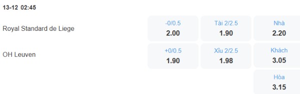 Standard Liege đang là đội có phong độ tốt hơn (thắng 2, hòa 1 trong 3 trận gần nhất so với hòa 1, thua 2). Cộng với lợi thế sân nhà thì sẽ không có gì ngạc nhiên nếu họ chơi tốt và giành chiến thắng trước Leuven. Nên với tỉ lệ kèo Standard Liege chấp 0.25 thì người chơi nên đặt cửa cho đội bóng chủ nhà thì cơ hội thấng cuộc cao hơn.