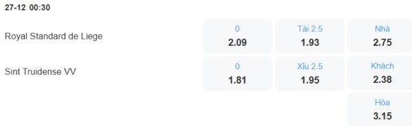 Nhận định kèo Standard Liege vs Sint Truidense, 0h30 ngày 27/12